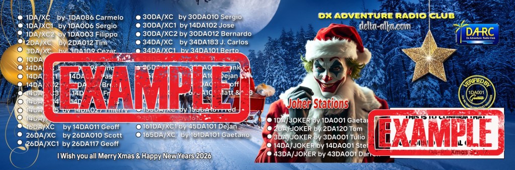 Please sent standard contribution 3 euro for the double QSL Card. If you want you can add 0,60 euro for every DA-RC Xmas banner do you want. PayPal to: 1da005gae@gmail.com don’t’ forget to write your callsign, full address and the list of the activator ad Joker you QSO.